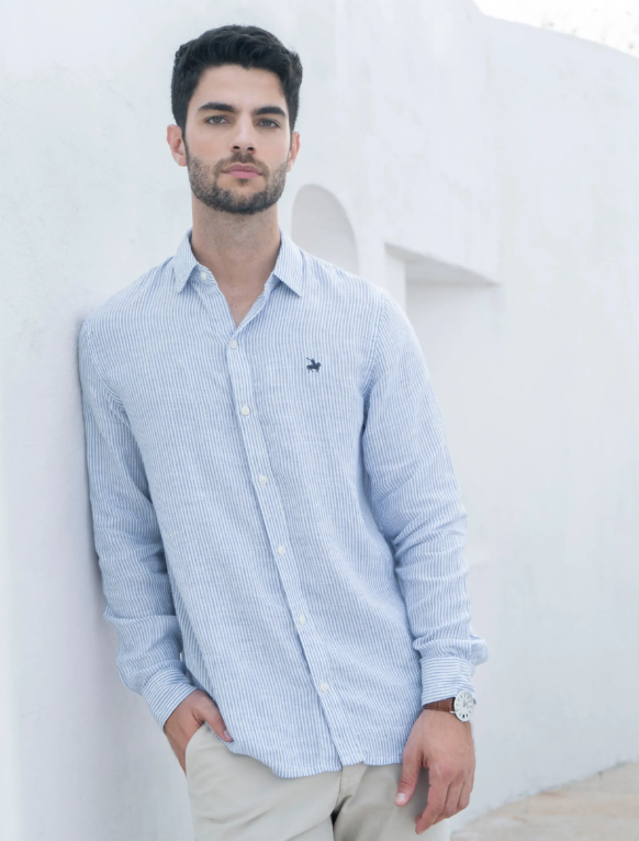 Camisa con cuello francés, confeccionada en un Oxford ligero con un delicado patrón de rayas azul. Su textura fresca y su caída suave la convierten en una pieza versátil, ideal tanto para un look relajado como para ocasiones más elegantes.